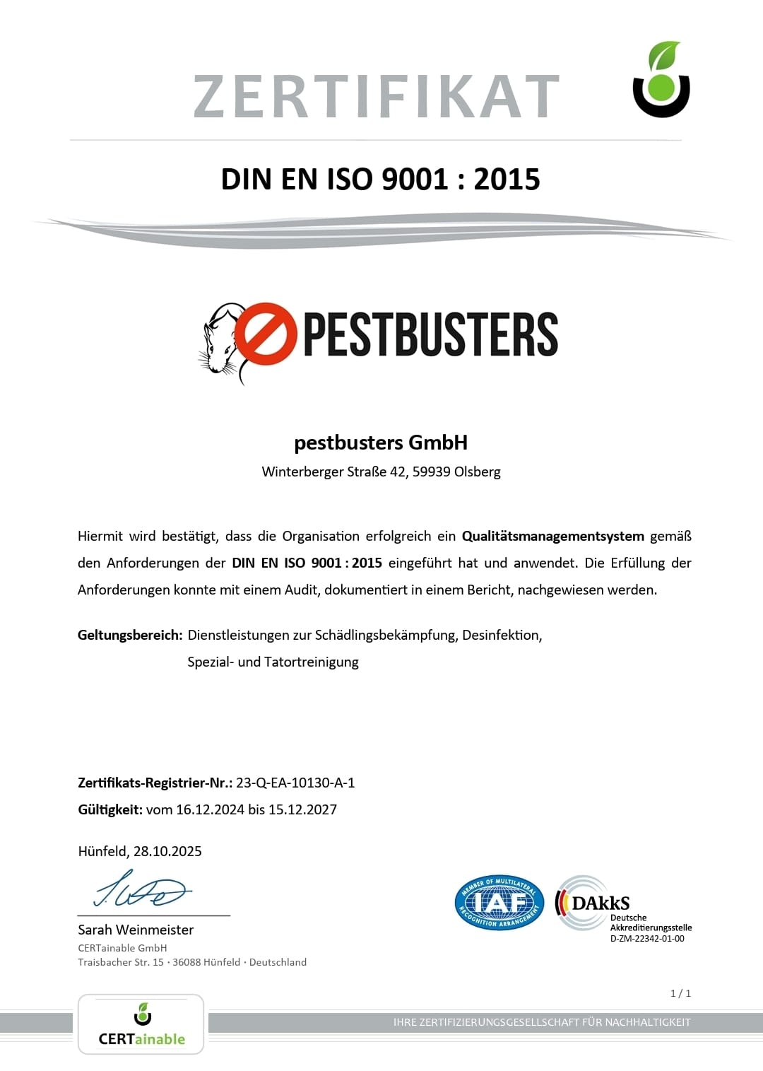 Ich kann die Pestbusters jedem empfehlen, der eine zuverlässige und seriöse Schädlingsbekämpfung sucht!